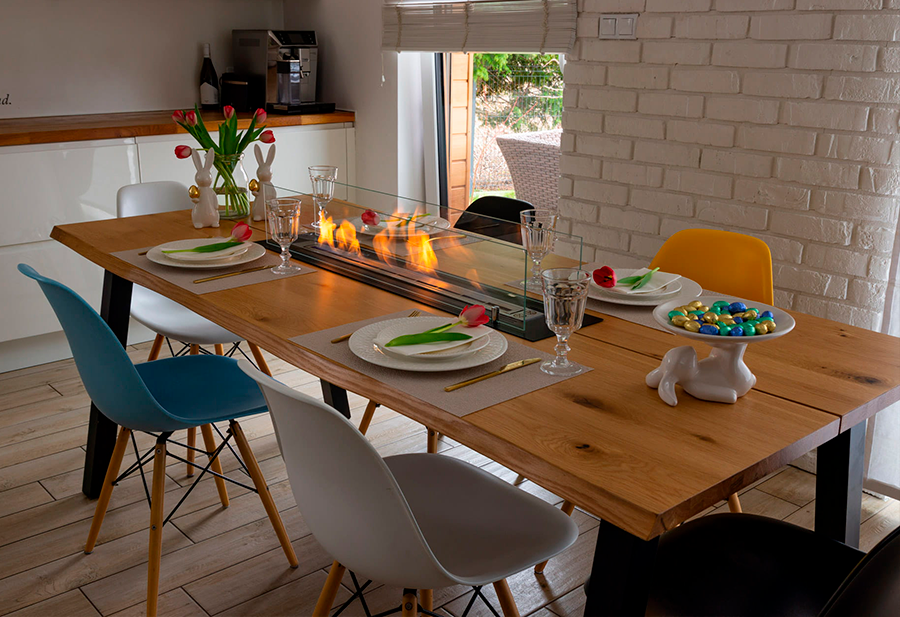 Fyrne Ember er våre signaturbord med integrert flamme – laget for samtaler som varer lenge etter måltidet. Bygd i heltre og stål, med levende ild i senter.