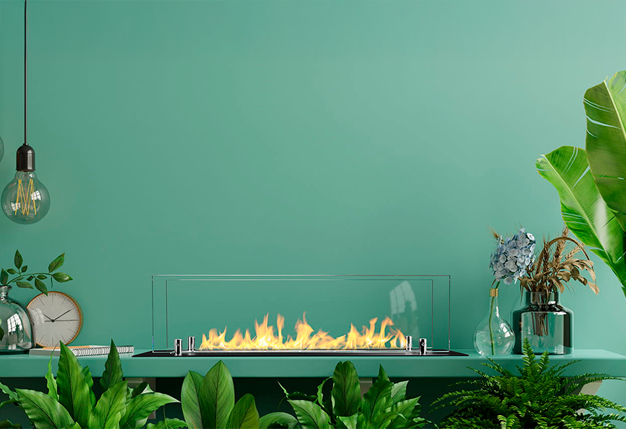 Benk med innebygd biopeis. Bordplaten er av naturlig eik eller furu, i valgfri farge, med ben av sort stål.